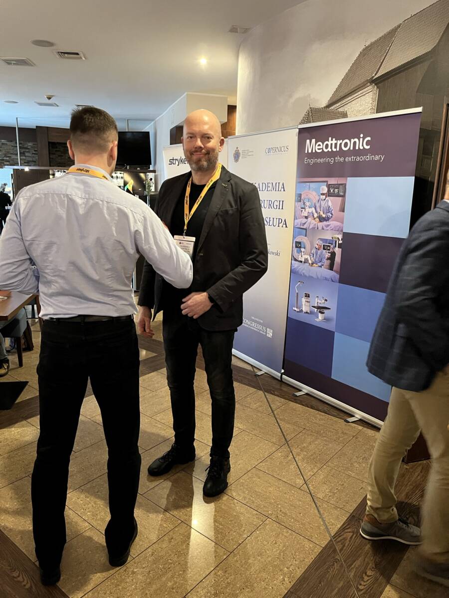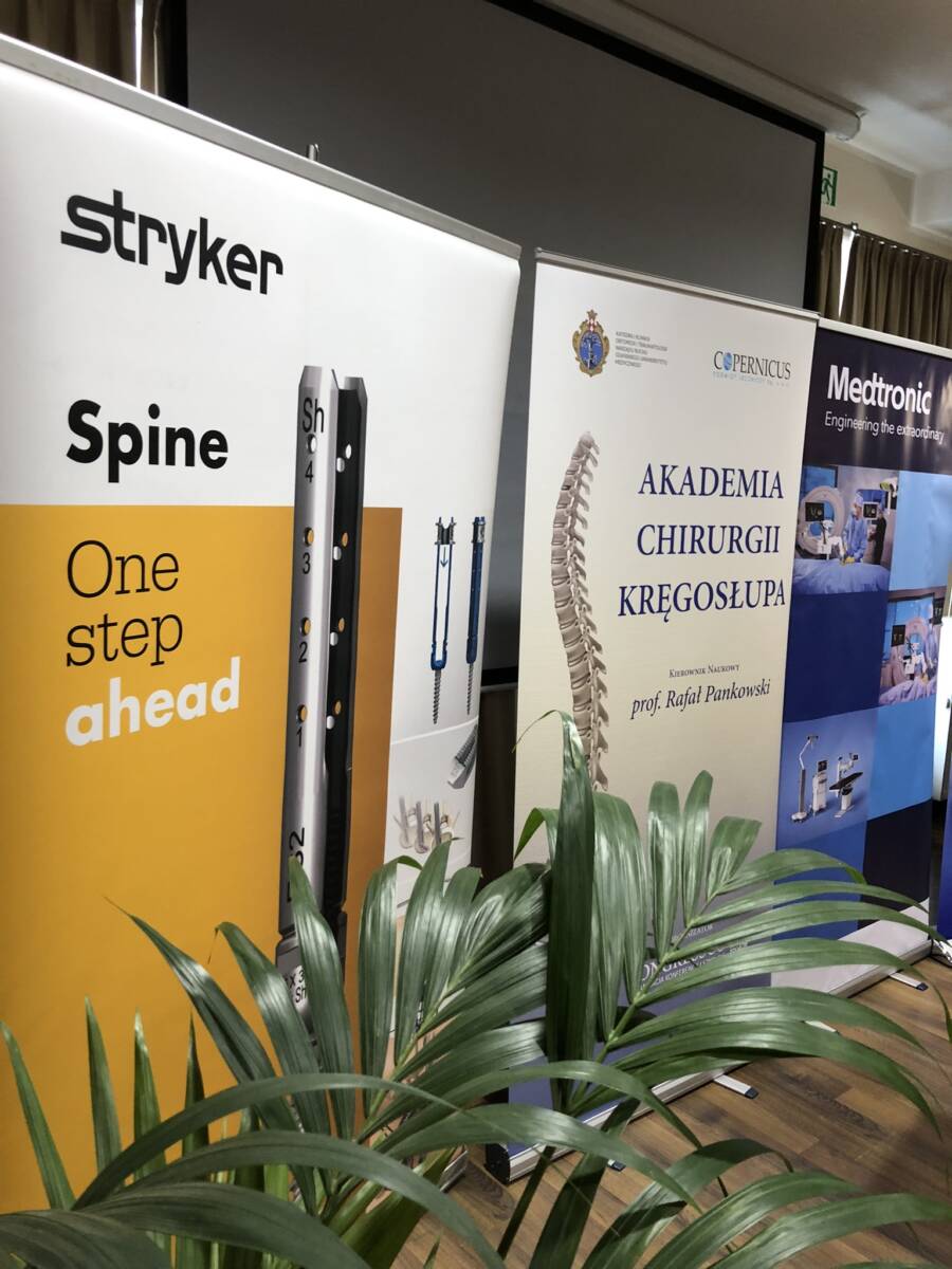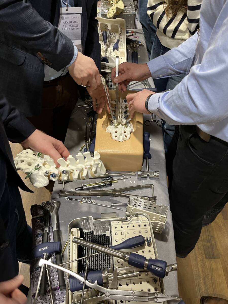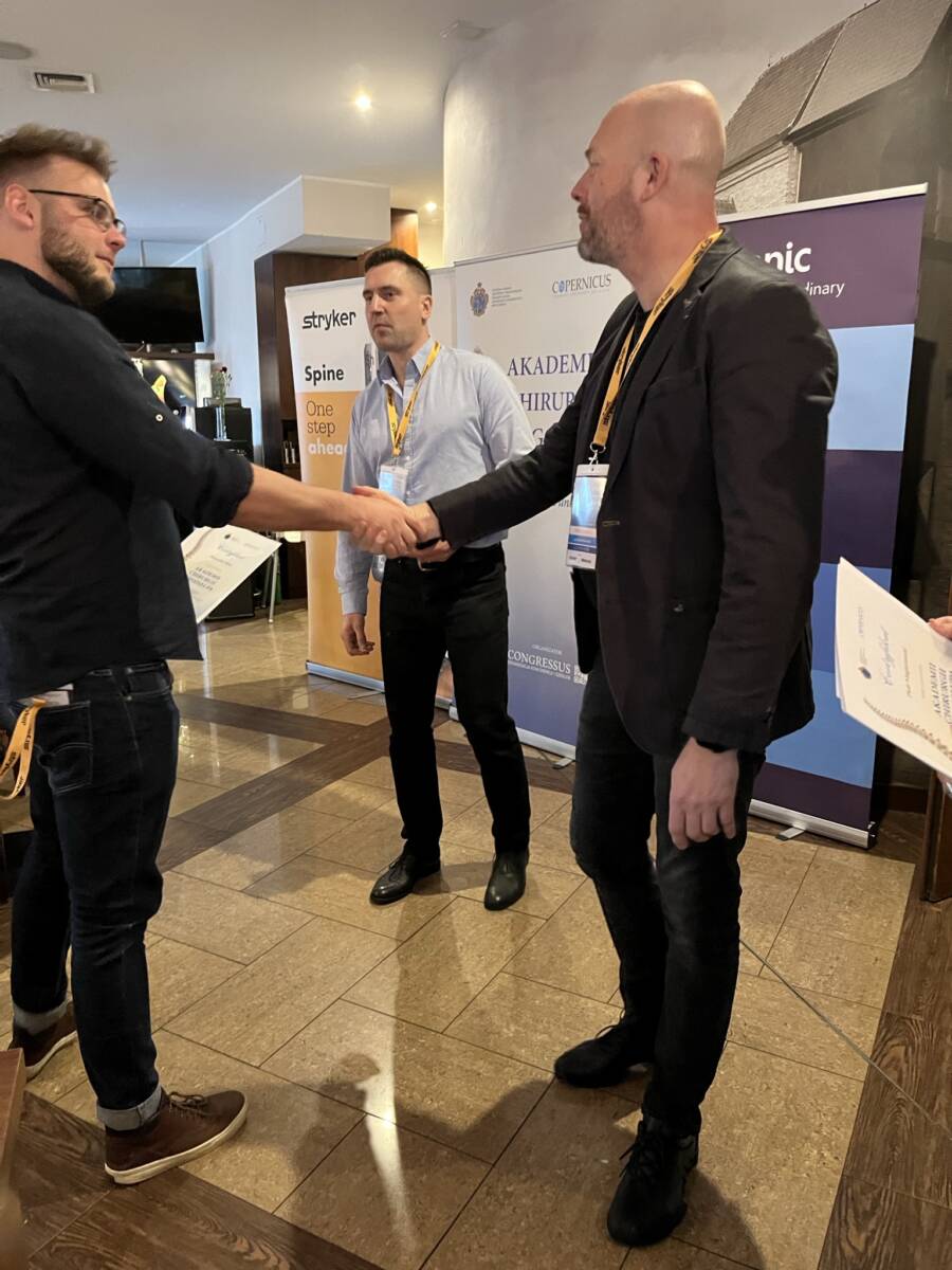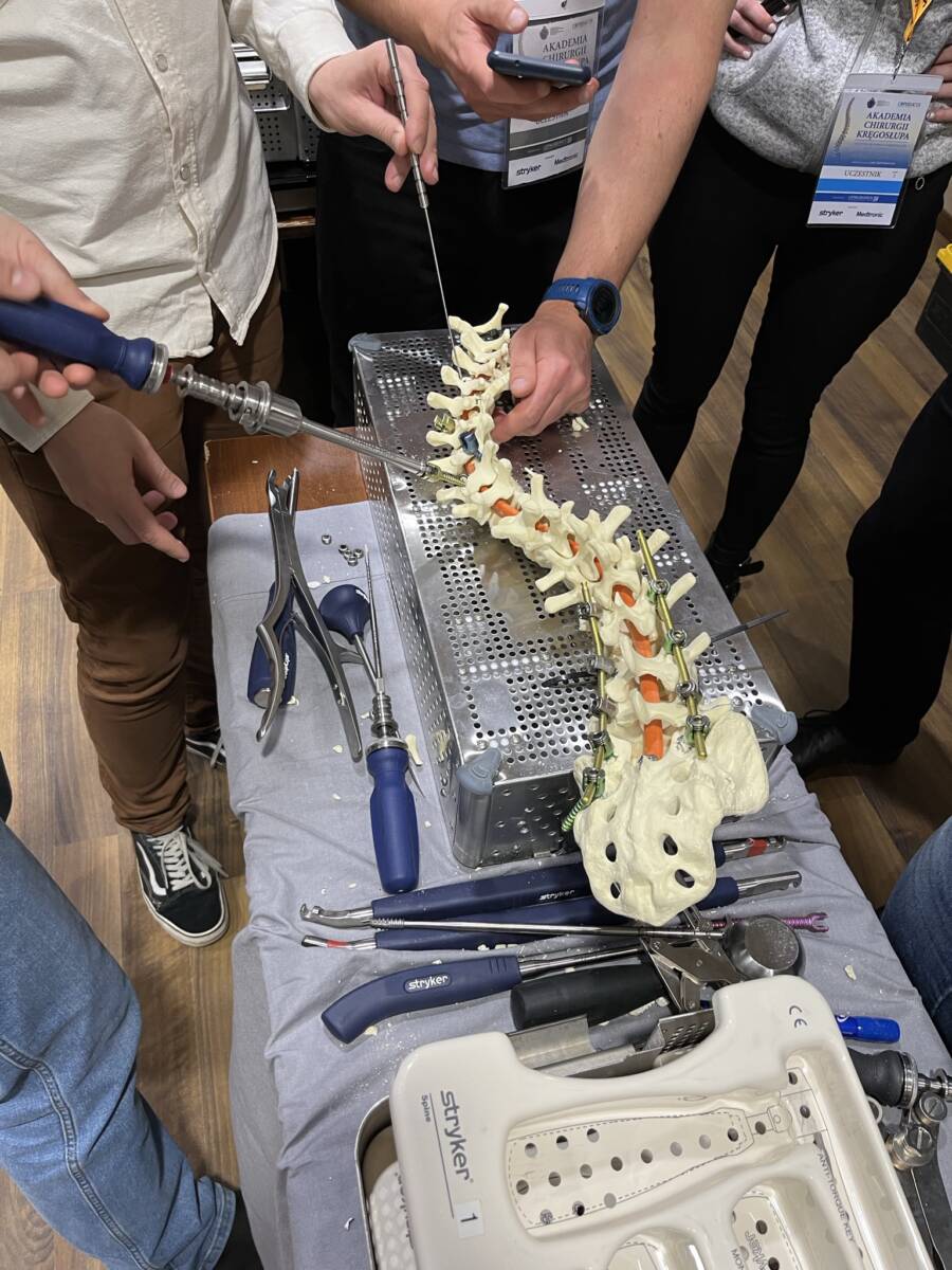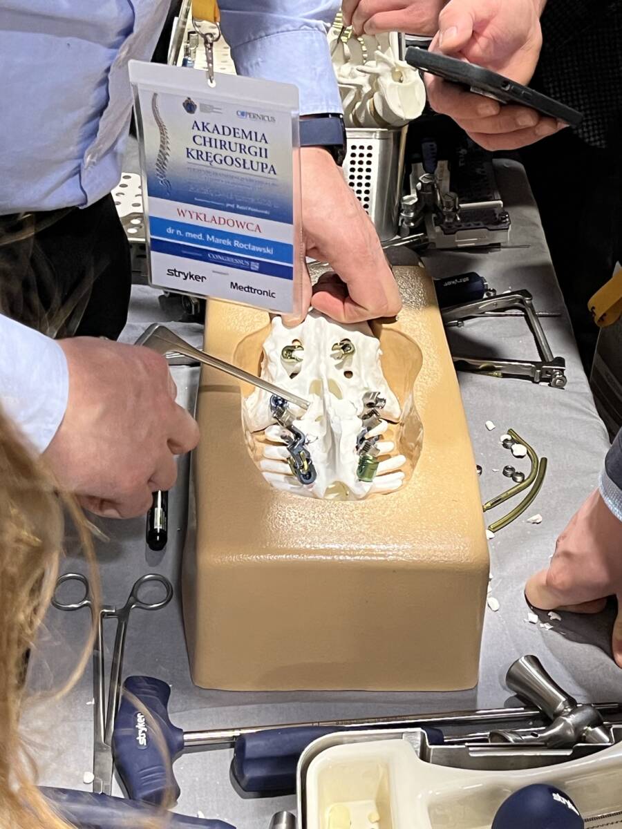 W dniach 12-13 marca 2023 r. w Gdańsku odbyła się pierwsza edycja Akademii Chirurgii Kręgosłupa, której pionierem był prof. Rafał Pankowski. Inauguracyjne spotkanie przerosło nasze oczekiwania, pod względem przygotowania współpracujących z nami firm Medtronic i Stryker oraz zaangażowania uczestników, którzy podzieleni na bardzo małe grupy, mieli okazję ćwiczyć techniki operacyjne oraz wykonywać zespolenia pod okiem prof. Rafała Pankowskiego i dr n. med. Marka Rocławskiego. Pierwszy dzień przebiegał na sali wykładowej, gdzie swoje prezentacje urozmaicone dyskusjami wygłosili obok prof. Pankowskiego i dr n. med. Rocławskiego, lek. Adam Augustyniak i lek. Sergiusz Bielocerkowski. Warsztaty odbywające się drugiego dnia nie byłyby tak ciekawe, gdyby nie firma Medtronic, która z niebywałą wiernością odwzorowała salę operacyjną oraz zaprezentowała innowacyjny robot MAZOR X. Uczestnicy za pomocą stworzonego trójwymiarowego obrazu mogli obserwować narzędzia oraz struktury anatomiczne, wcielając się w rolę operatora planującego zabieg. Podobne uatrakcyjnienie zapewniła firma Stryker, udostępniając okulary 3D szczycące się ogromnym zainteresowaniem. Poniżej relacja fotograficzna z wydarzenia, a kolejna edycja wkrótce!